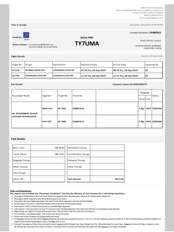 My Name is Muhammad Shahid passport no P1474364 Actually I came from Sharjah to Mumbai Flight no G9 405 ticket no 514237764794401 and when I was transfer to domestic no any indigo staff helped to get terminal 1 as i don’t know that it’s far away from international terminal and when I reached there through airport bus I got late and there was no proper board for boarding pass counter and even I was getting I found indigo staff for help they were saying to go here and there as at that I was so tensed and confused and flight got missed which is connected flight 6E-5246 &6E-7096 with PNR number TY7UMA and with this same PNR they booked another ticket by charging me and felt even aviation staff was not responding properly and I have never faced such situations in any airport not even domestic until I visited to Mumbai airport and I hope it will resolve my issue
