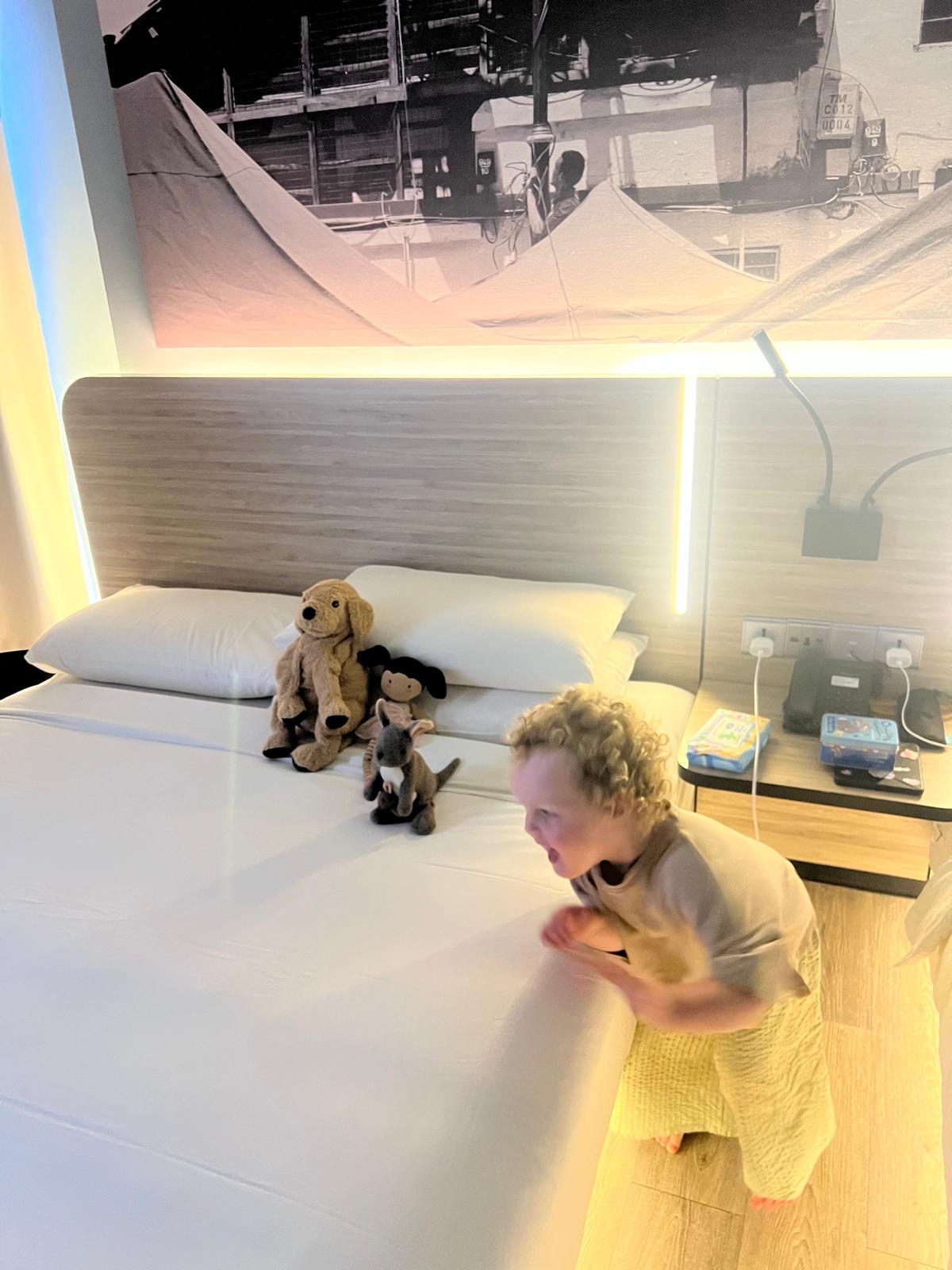 1 stuffed doll, with black hair and pink skirt and 1 stuffed kangaroo, grey